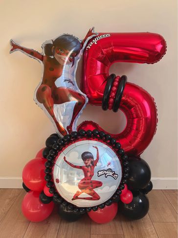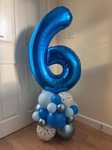 Includes, one foil number on a standard 12 balloon base stack with up to 3 additional smaller foil balloons to match the theme, with personalisation.