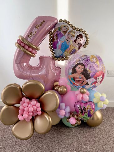 One foil number with additional foil character and shapes. Also can include balloon flowers and decor. Personalisation included.